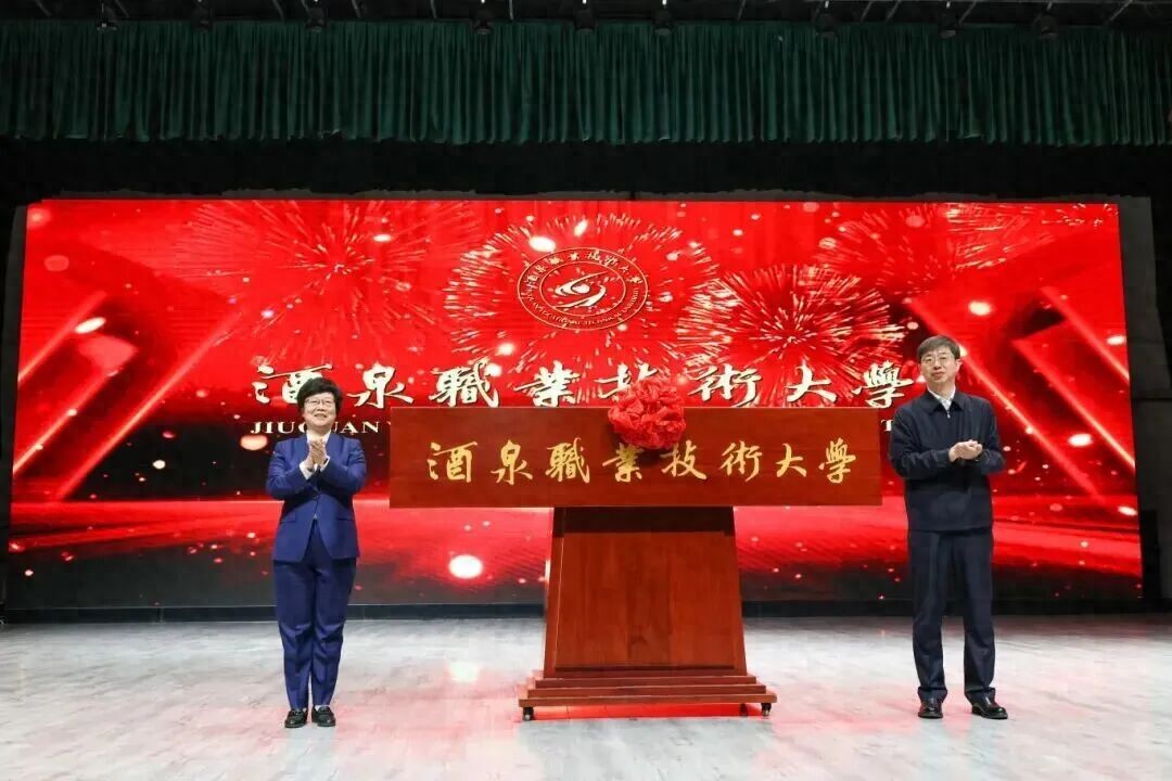甘肃省副省长王旭和酒泉市委书记王立奇共同为酒泉职业技术大学揭牌。