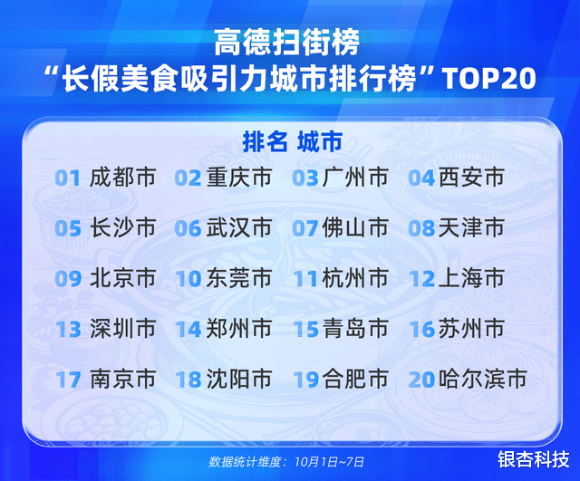 “好玩又好吃”成为广大游客出行决策的新标准,“美食+美景”让更多人愿意去、待得住。高德扫街榜数据显示,全国《长假美食吸引力城市排行榜》的前20名依次是:成都、重庆、广州、西安、长沙、武汉、佛山、天津、北京、东莞、杭州、上海、深圳、郑州、青岛、苏州、南京、沈阳、合肥、哈尔滨。