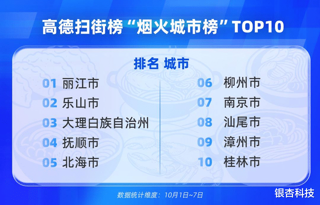 10月1日-7日,高德扫街榜“烟火城市榜”的前10名依次是:丽江、乐山、大理、抚顺、北海、柳州、南京、汕尾、漳州和桂林。这些城市上榜烟火小店的流量占比最高,其中多数在长假同时迎来了旅游和餐饮消费的峰值。