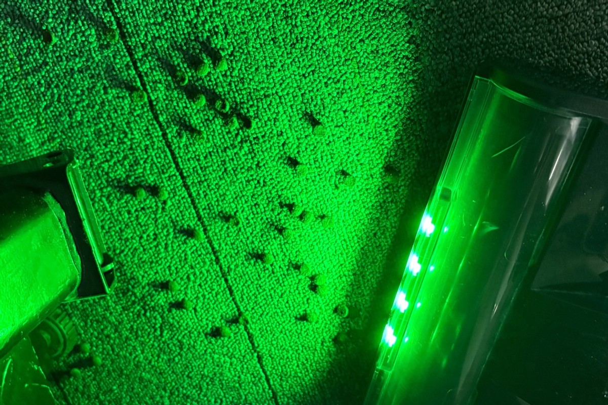 普通室内照明是从上往下的,地面上的灰尘很难形成阴影,肉眼看着干净,其实全是死角。很多老款机器为了省成本不加显尘灯,或者只加个没什么用的照明灯。现在主流的绿光显尘技术,是利用光的折射原理让灰尘显形。没有这个功能,吸地就像盲人摸象,不仅效率低,还容易漏吸,清洁效果大打折扣。