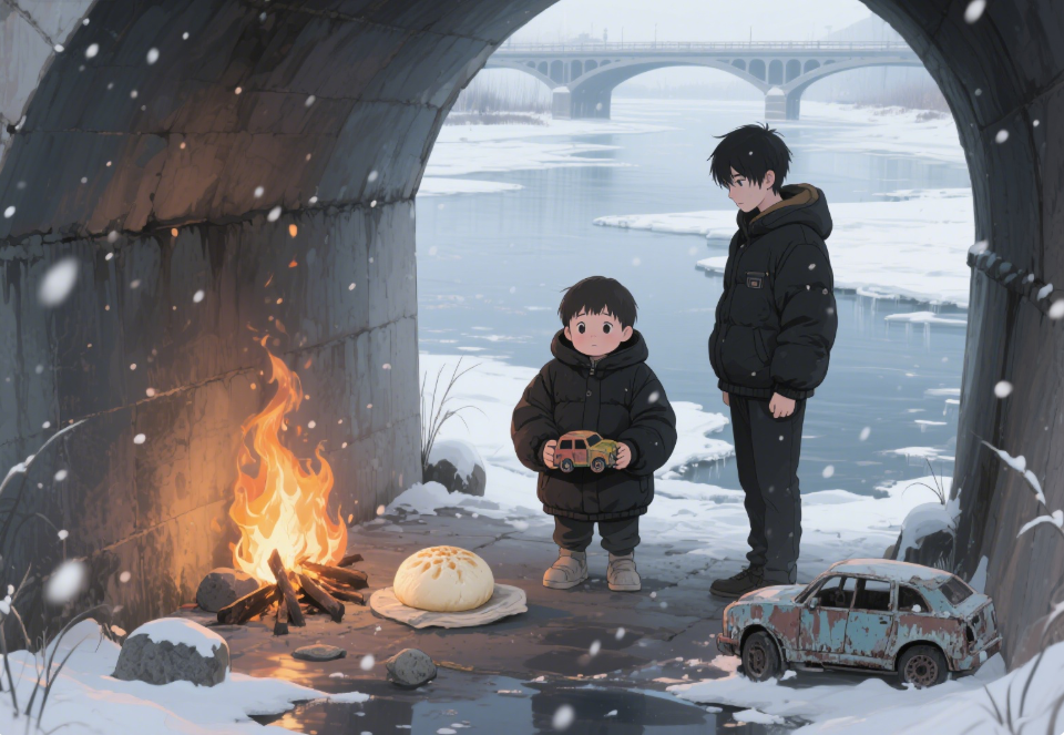 12 月 18 日那天,我在桥洞下生火取暖,突然听到一阵轻微的脚步声。我抬头一看,一个小男孩站在桥洞门口,穿着单薄的黑色棉袄,裤子上破了好几个洞,露出的脚踝冻得通红。他手里攥着一个破旧的玩具车,眼神怯生生的,好像很怕我。