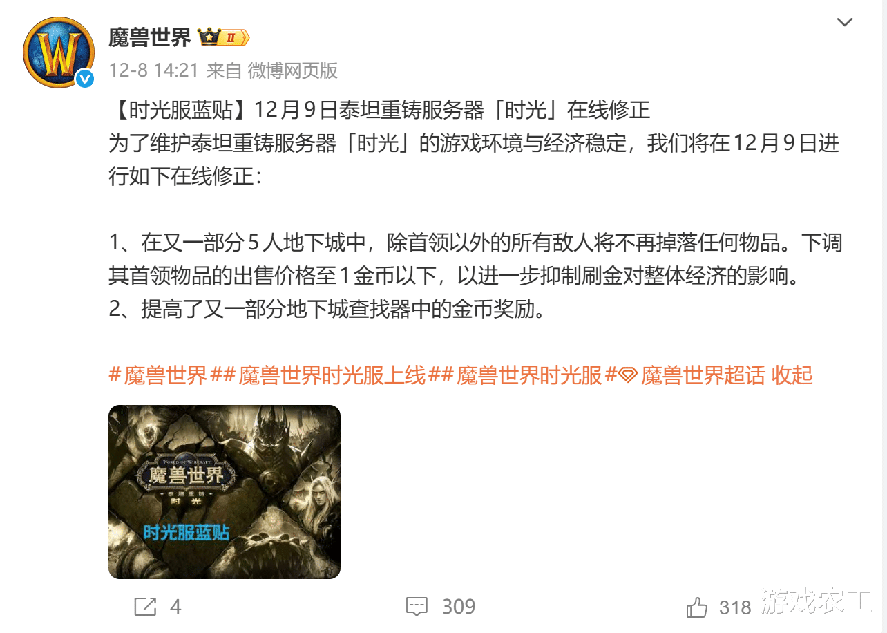 最近雷火开始对魔兽世界时光服中利用五人本刷金币的行为进行打压。官方希望通过抑制刷子刷金币来维护游戏中的金币价格,并且定向提高了一部分地下城查找器中的金币奖励,以此弥补普通玩家因取消地板金等造成的损失,从而更有效地打压刷子玩家,逼迫他们放弃刷五人本等行为。然而,玩家发现目前刷子又有了新玩法,甚至收入还不低。