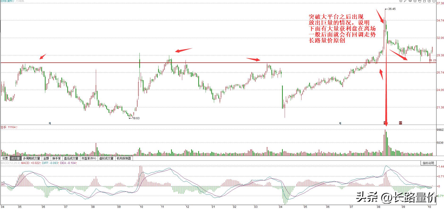 而且一般的股价的走势,都是在突破之后,会有回踩平台的情况发生,而且是绝大多少的股票在走出突破大的平台之后,会有回踩突破的平台的走势。为什么会有这种情况发生呢?因为当股价在走出突破的走势之后,大家都能看出来,股价突破了,肯定会有很多人顺势进场去追。