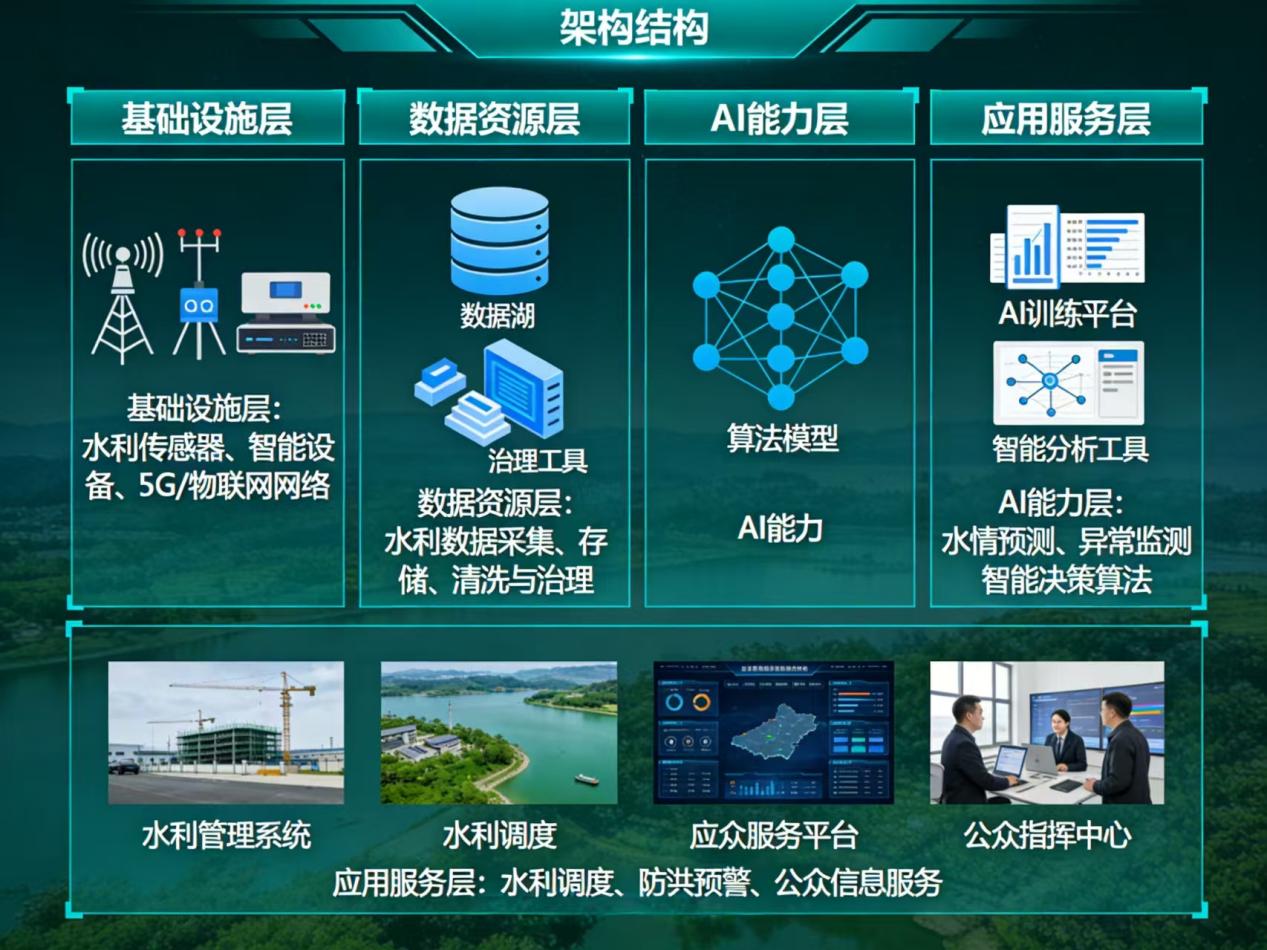数据资源层:负责数据的采集、存储、处理和分析。通过部署多类型传感器和监测设备,实现对水利要素的实时监测和数据采集。利用大数据处理技术,对海量水利数据进行清洗、转换和集成,构建统一的数据资源池。通过数据治理和质量控制,确保数据的准确性、完整性和一致性。