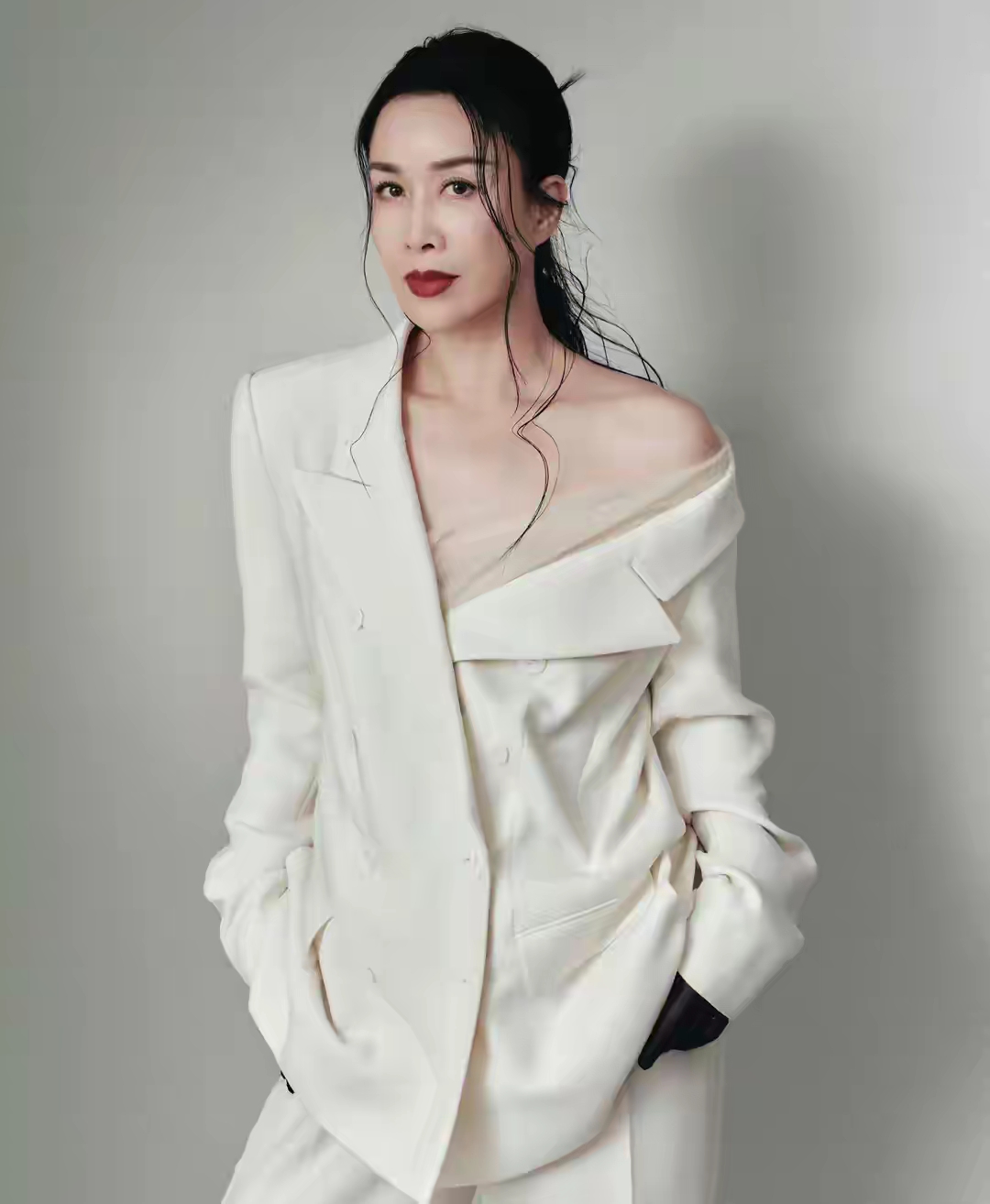 同样是内娱“大姐”的那英,别看已经57岁了,但一出马就惊艳四方,先是红毯上一身白西装,露肩小设计夺人眼球。