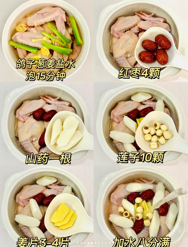 山药红枣鸽子汤是一道营养全面的汤品,非常适合冬季食用。山药含有丰富的淀粉、黏液蛋白和多种微量元素,有助于增强消化系统的功能,同时对于调节血糖和增强免疫力也有积极作用。红枣则富含维生素C、铁和钾,对于提升免疫力、改善血液循环和缓解疲劳有显著效果。鸽子肉作为高蛋白、低脂肪的肉类,含B族维生素和矿物质,对增强体质和恢复体力有很好的作用。