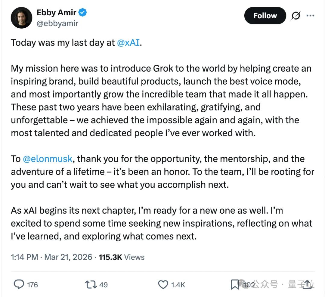 Ebby Amir,3月21日宣布离职,过去两年负责Grok的品牌推广、产品设计、语音模式开发和团队建设;