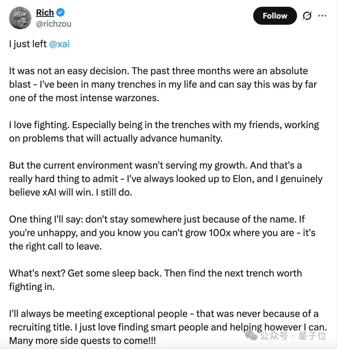 Rich Zou,3月24日宣布离职。他发文表示这是一个艰难的决定,过去三个月是一段非常激烈的“战壕”经历,但当前环境不利于他的成长。