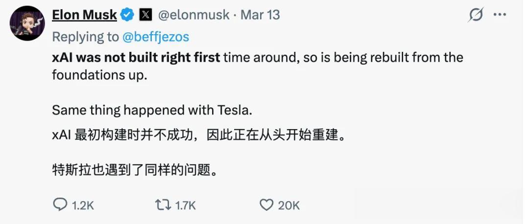 马斯克要从头建面对创始团队的大批流失,马斯克亲口承认,xAI一开始没建对,现在要从头再来。