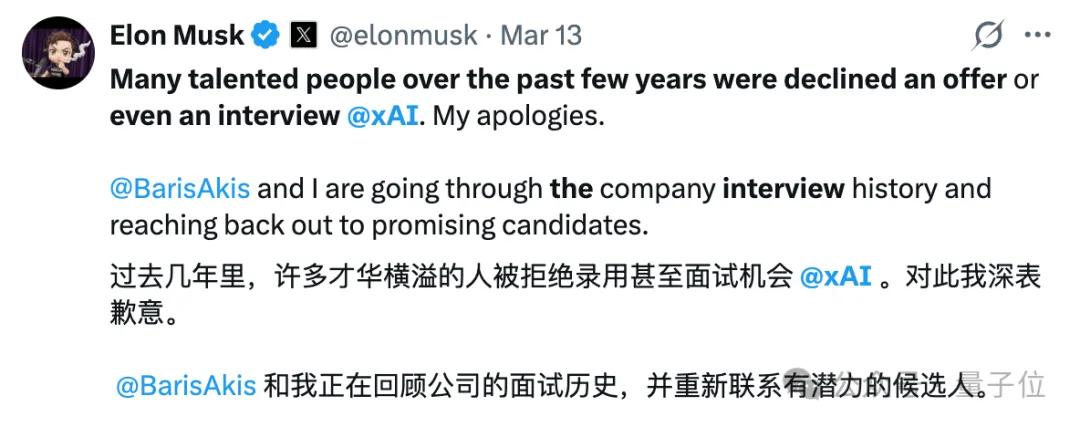 过去几年里,很多有才华的人都被拒绝了在@xAI的录用通知,甚至连面试机会都没有。对此我深表歉意。