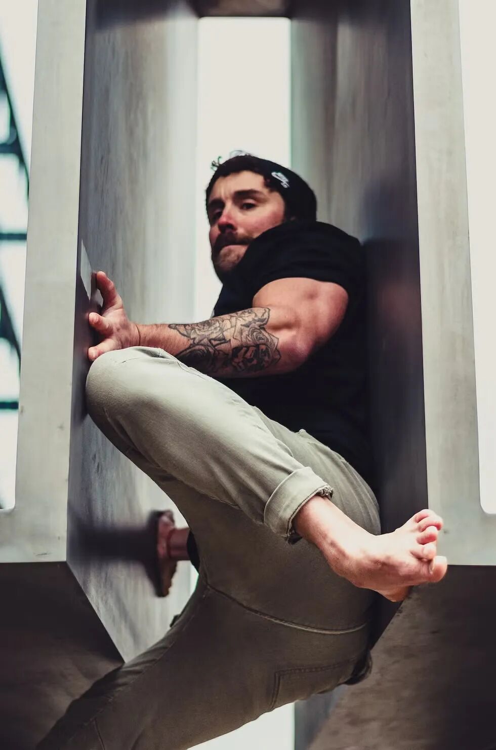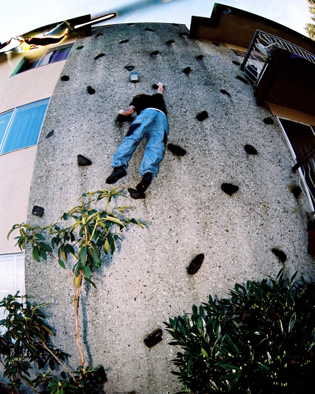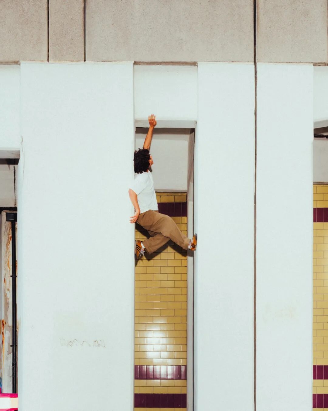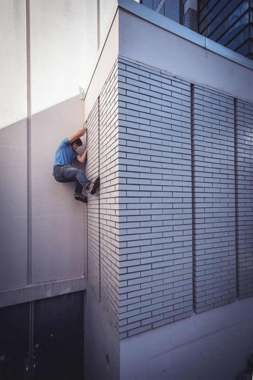 他用尽浑身解数,尝试通过身体的不同部位去触碰任何一个稳固的支点,抱住墙壁上凹陷的位置,顶着大约 50cm 宽的对立墙面缝隙等特殊的建筑结构,然后继续往上挪动身体,最终到达大约离地 3.5 米的终点处。
