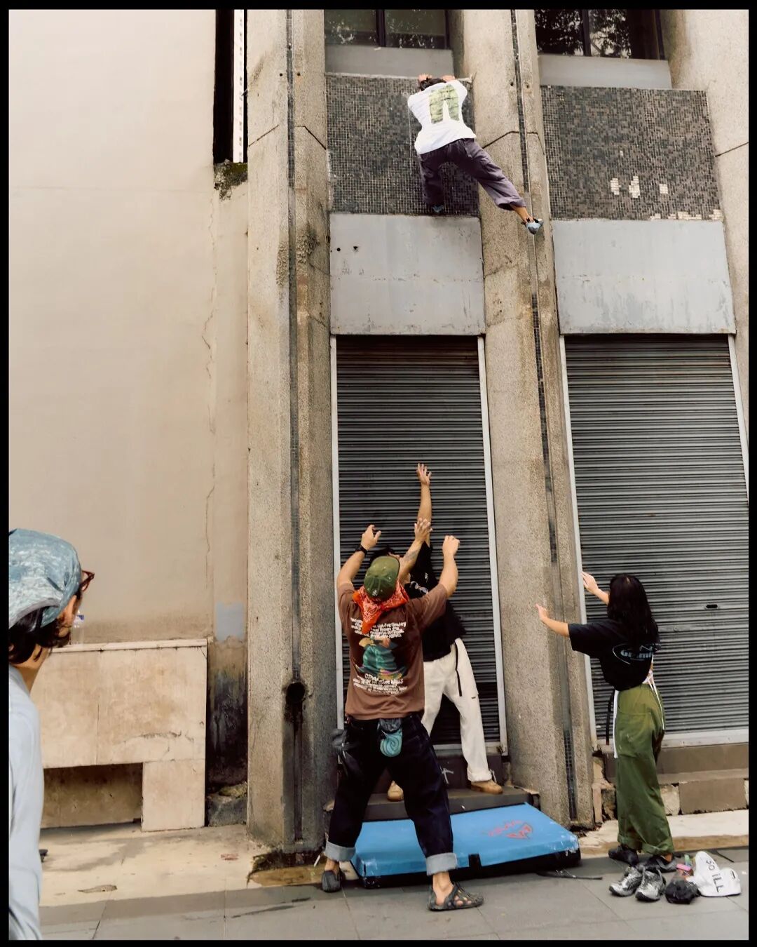时至今日,Buildering 还是一项非常有特色且小众的攀爬运动。简单来说,它可以被定义为:“在不使用绳索等传统攀岩保护装备的情况下,在城市环境中攀爬建筑物、雕塑和其他人造结构的运动。”中文直译过来的话,我会比较喜欢“建筑攀岩”这个词。