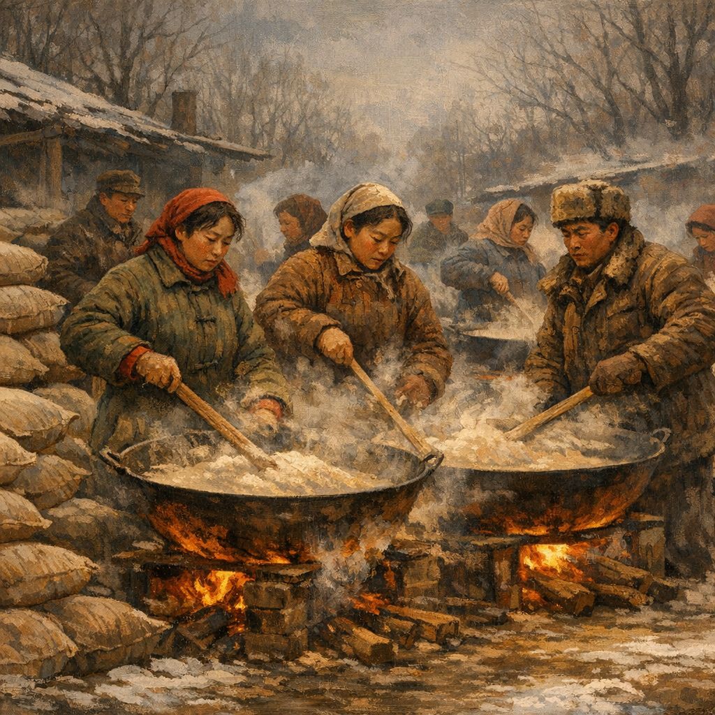 1950年底,东北各省发起了大规模的炒面运动。工厂、机关、学校、居民,全民动员,家家户户支起大锅炒面粉。据《抗美援朝战争后勤经验总结》记载,在最高峰的那段时间里,东北地区每天可以生产几十万斤炒面,源源不断地往前线运。