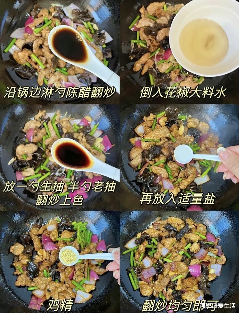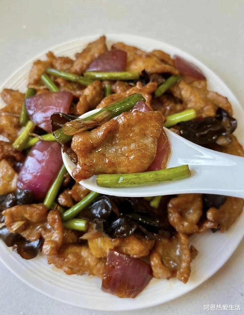 看,一盘色泽金黄、芡汁明亮、酥软鲜香的过油肉就做好啦!夹一片放入口中,肉的嫩滑、蒜苔的清脆、木耳的柔韧,伴着酸香开胃的滋味在舌尖共舞,真是米饭的绝佳杀手!