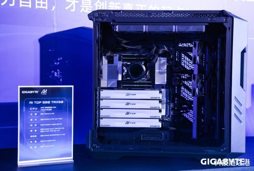 着眼于未来计算需求, “创心,布局未来”分区重点展示了技嘉 AI TOP 系列全家桶。整机采用了AMD Ryzen Threadripper PRO 7965WX处理器、技嘉TRX 50 AI TOP 主板以及技嘉独家定制的四路AMD Radeon AI Pro R9700 32G的强大组合,赋予了超过500 TFLOP/s的超大算力,为个人和企业工作者在AI、设计、渲染等内容创作工作中带来了全新体验。