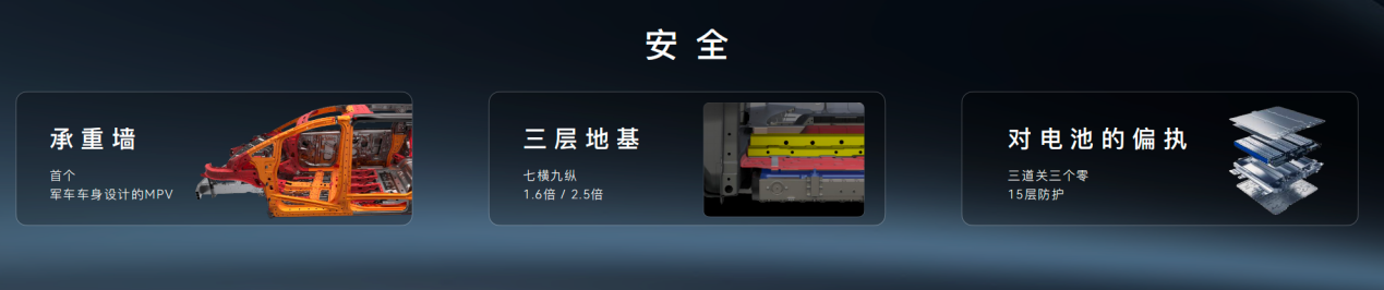 安全性上,泰岳平台做了很多“傻实在”的事情。泰岳平台首次把军车车身设计标准搬到了一台MPV上,打造车上的“承重墙”;地板七横六纵结构,足足做了“三层地基”。另外,电池开发过程对安全品质的追求近乎偏执:电芯生产原材料追求“零杂质”、制造过程力求“零缺陷”、电芯成组强调“零短板”。不仅如此,电池包还做了15层的立体硬防护结构;面对特殊情况,电芯侧面都包了一层能耐1000℃高温的航空级隔热材料,顶部还有一层耐1200℃陶瓷化阻燃结构,给每个电芯筑成了一个“安全屋”。