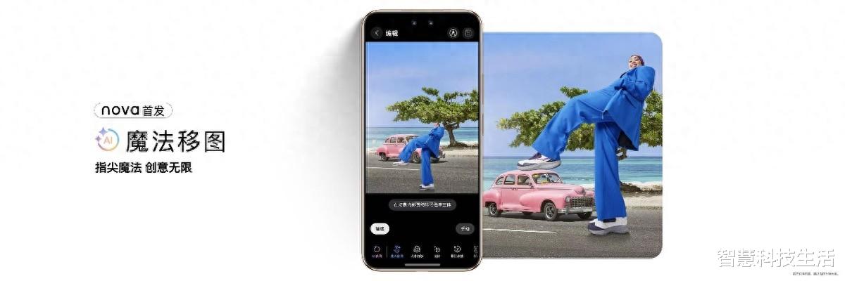 比如“AI魔法移图”功能就非常实用,照片里需要调整位置的物品或人用手指拖一下就搞定,以前P图P到到怀疑人生,现在用它就能轻松完成。还有“AI人像精修”功能,支持调整光影、景深、色调、构图等参数,成图效果高清自然,堪比专业修图师!