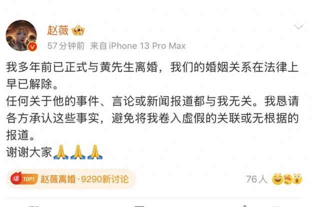 可赵薇这一整篇离婚文案,冷漠、疏离,恨不得所有人都知道她跟黄有龙早已没了关系。