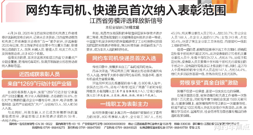 近日,江西、江苏等多省份相继公布2026年劳动模范和先进工作者拟表彰人选,一个显著变化引发关注:穿梭在大街小巷的网约车司机、快递小哥等新就业形态劳动者,首次被纳入省级劳模表彰范围。