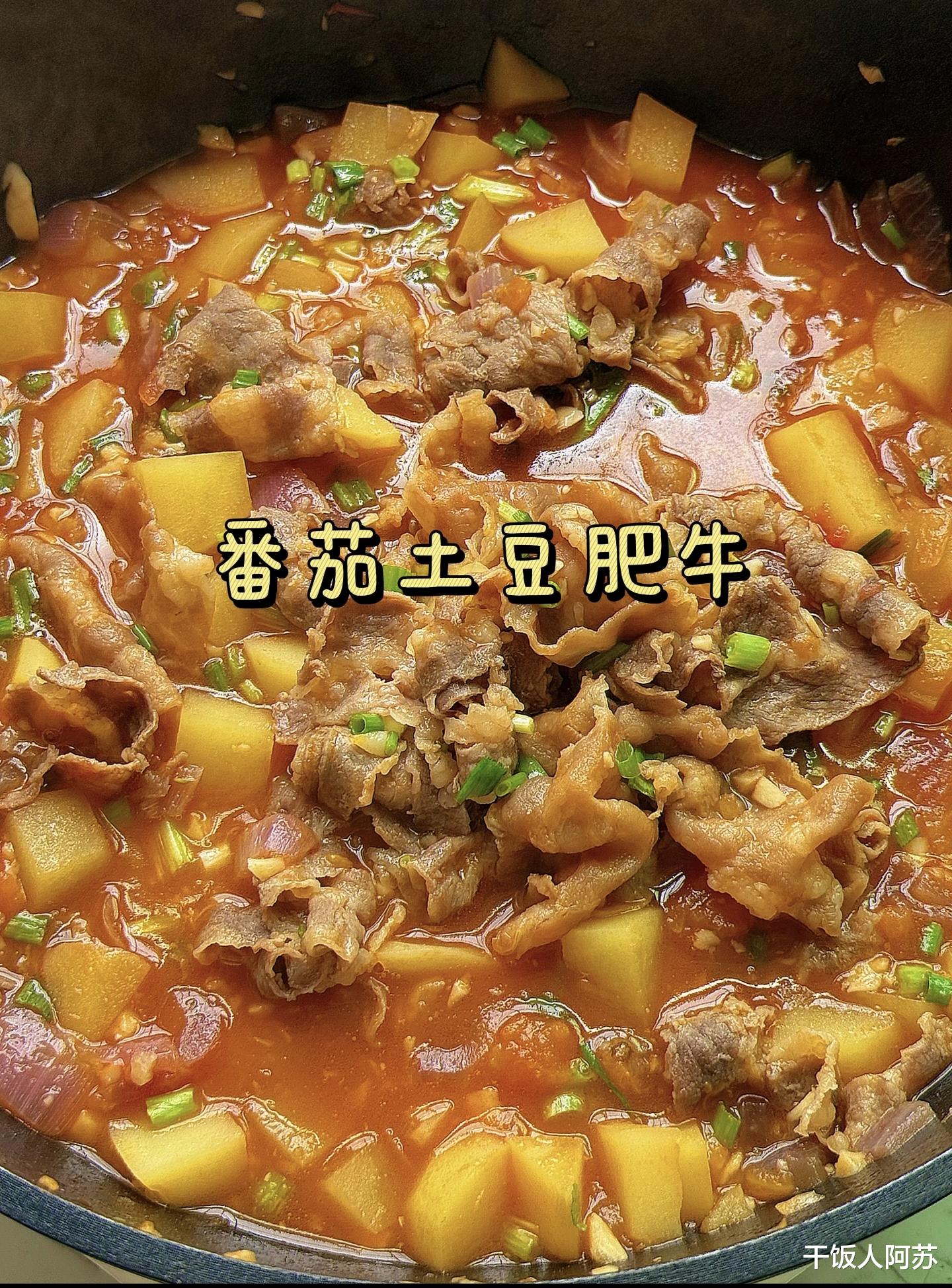 最后把焯好的肥牛卷倒进锅里,用铲子轻轻翻拌,让每一片肥牛都裹满汤汁,再撒上一把切碎的葱花,就可以关火出锅了。这时候的肥牛吸饱了番茄的酸甜和土豆的粉糯,入口软嫩多汁,土豆一抿就化,汤汁用来拌米饭更是一绝,连吃三碗都不过瘾。