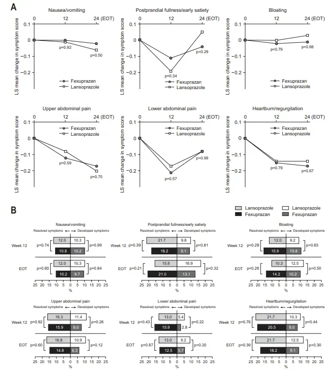 PAGI-SYM总评分变化:fexuprazan–2.22,lansoprazole–2.23,差值–0.42(95%CI–2.48~1.64,p=0.69),各症状域亦无统计学差异。亚组分析:危险因素≤2者,fexuprazan溃疡率1.20%,lansoprazole 2.87%,差–1.70%(–4.70%~1.29%,p=0.27);≥3者两组均为0例。安全性:治疗相关不良事件8.57% vs 4.78%(p=0.12),多为轻-中度胃肠不适;严重不良事件两组均低于4%,无死亡,无骨折或艰难梭菌感染信号。作者原话总结:“Fexuprazandemonstrated non-inferior efficacy with a similar safety profile, suggesting it as a promising alternative for NSAID-induced PU prevention.”