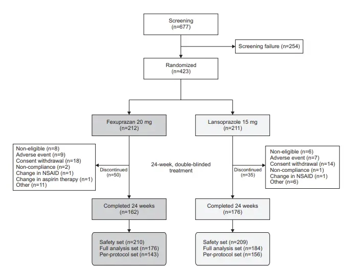总结这项韩国32中心研究首次以硬内镜终点证实:P-CAB新秀fexuprazan20 mg/d在24周NSAID“胃火战场”上,溃疡预防能力不逊于经典PPI lansoprazole 15 mg/d,且零出血、症状缓解与安全性完全打平。
