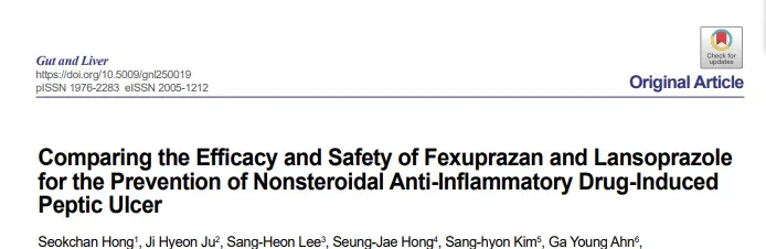 但理论再美,也得搬上NSAID主战场验血。2025年6月26日,Gut and Liver在线发表了一篇题为“Comparing the Efficacy and Safety ofFexuprazanand Lansoprazole for the Prevention of Nonsteroidal Anti-Inflammatory Drug-Induced Peptic Ulcer”的文章,把P-CAB家族新秀fexuprazan直接推到与经典PPI lansoprazole的24周头对头擂台。