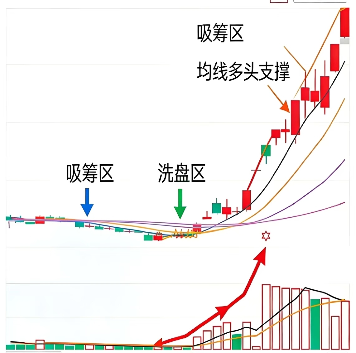 从K线图上看,主力操盘往往会经历“吸筹—洗盘—拉升”三个阶段:吸筹区股价横盘震荡,成交量温和放大;洗盘区股价小幅下跌,成交量明显萎缩,且均线多头排列形成的支撑位始终不破;拉升区股价突破洗盘平台,成交量大幅放大,这是典型的洗盘走势,后续拉升概率大。