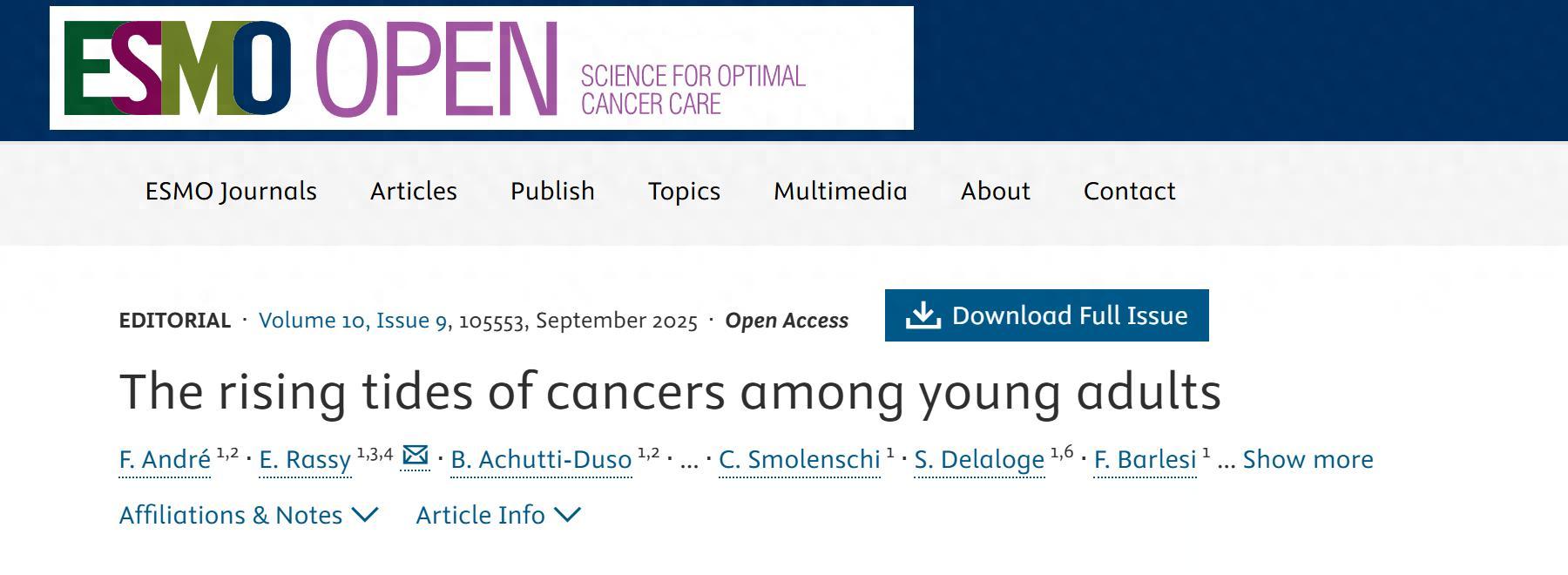 [1]André F, Rassy E, Achutti-Duso B, Boilève A, Smolenschi C, Delaloge S, Barlesi F. The rising tides of cancers among young adults. ESMO Open. 2025 Sep 3;10(9):105553. doi: 10.1016/j.esmoop.2025.105553. Epub ahead of print. PMID: 40907212; PMCID: PMC12446525.