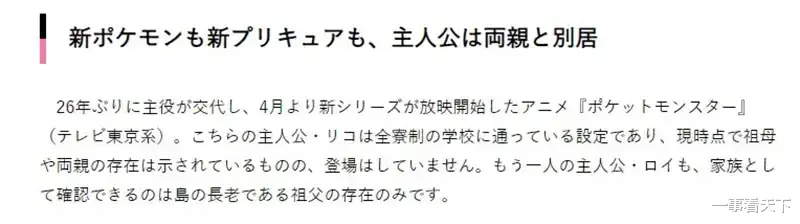 以去年4月新推出的《精灵宝可梦》为例,26年来首次更换了动画主角。新主角莉可目前就读寄宿学校,尽管剧中偶有提到她的父母与祖母存在,但至今尚未让他们登场。而另一名主角罗伊则只出现了他作为长老的祖父。