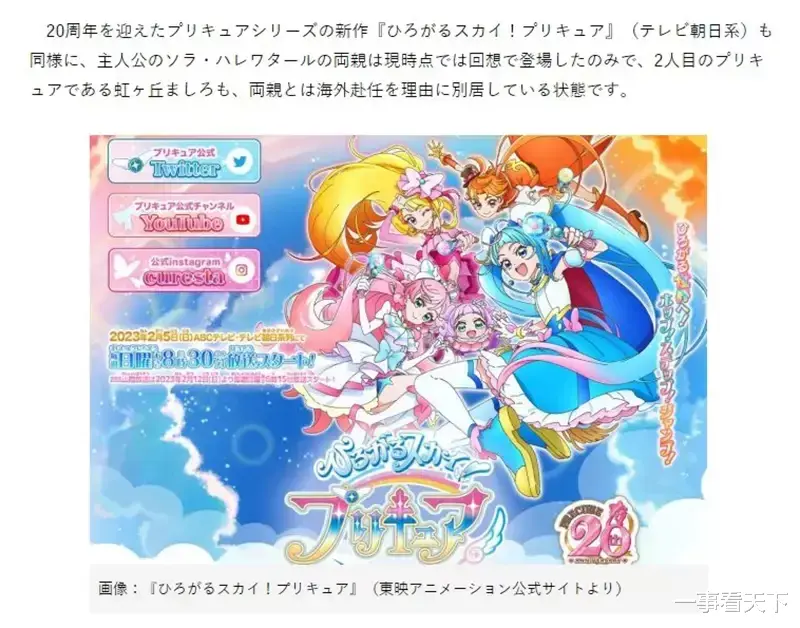 同样,20周年纪念系列《开阔天空!光之美少女》中,主角天晴·娃塔儿的父母仅限于回忆场景;而另一名主角虹之丘真白的父母则因工作分隔在国外。这样的设定让角色呈现出与父母分居、独自生活的情境,与传统家庭的“一家团聚”形成鲜明对比。