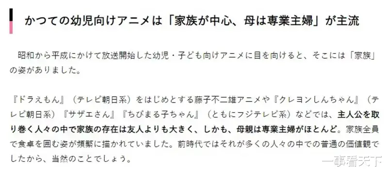 报道称,像《哆啦A梦》、《蜡笔小新》、《樱桃小丸子》、《海螺小姐》这类昭和与平成时期的人气动画,其故事多是围绕主角与家人展开的。
