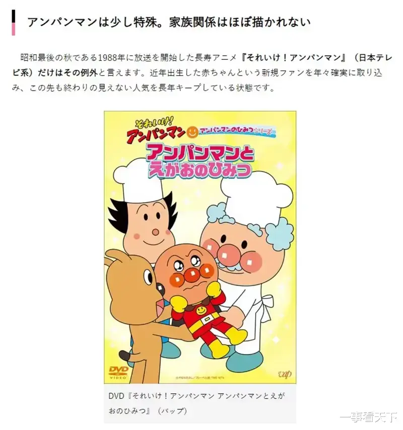 除了这些典型描写,还有例外存在。比如1988年开播的《面包超人》,几乎完全没有涉及家庭关系的设定,反而凭借温暖可爱的人物形象、轻松愉快的故事线赢得了无数观众的喜爱。