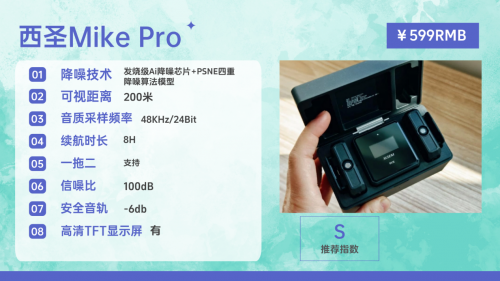 西圣Mike Pro走性价比路线,核心配置贴合入门创作需求。48kHz/24Bit采样搭配6mm全指向咪头,人声收音干净自然,日常口播、短视频录制时,语气细节和轻微气息都能较好还原。