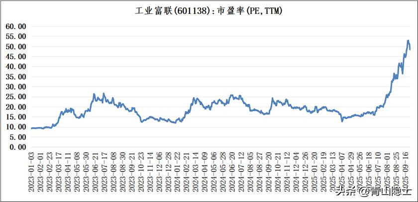 至7月30日,工业富联发布2025年半年度预告,明确上半年利润增速为38.61%,其中,二季度利润同比增加51.1%。在市场情绪推动下,工业富联的市盈率(TTM)被迅速拉升至52倍左右,如今回落至48.5倍。