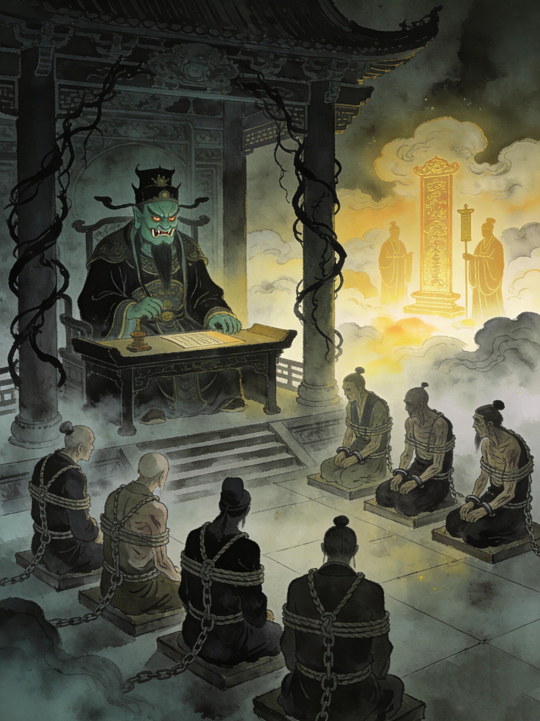 就在这时,忽然有一位身着官袍、手持笏板的使者捧着圣旨赶来,身后随从都捧着光鲜的官帽礼服。那阎王见状,立刻离座跪拜在地。