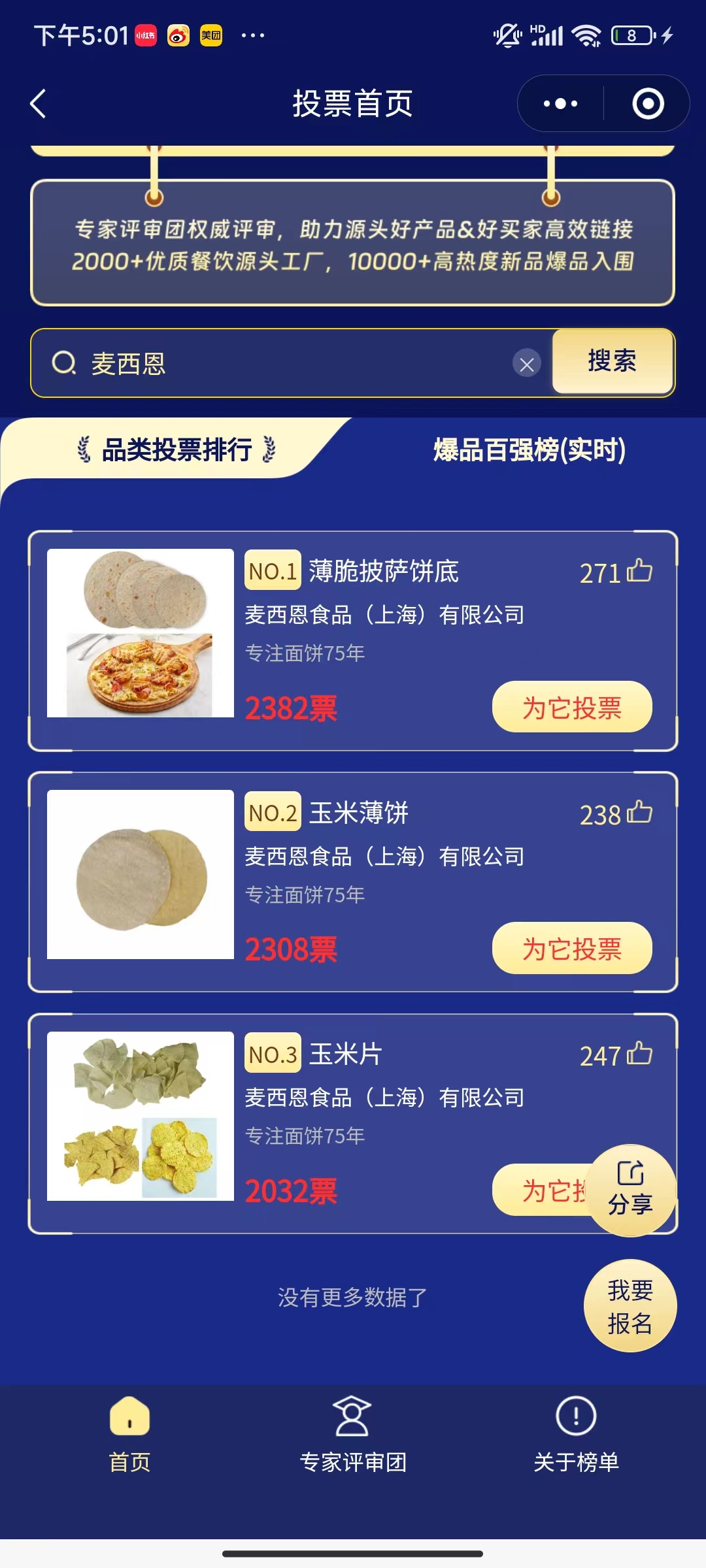【第二届中国餐饮供应链爆品TOP榜】线上投票火热进行中,麦西恩的三款产品入围评选,它们分别是薄脆披萨饼底、玉米薄饼、玉米片,如果你也喜欢这些产品,欢迎为Ta投票!