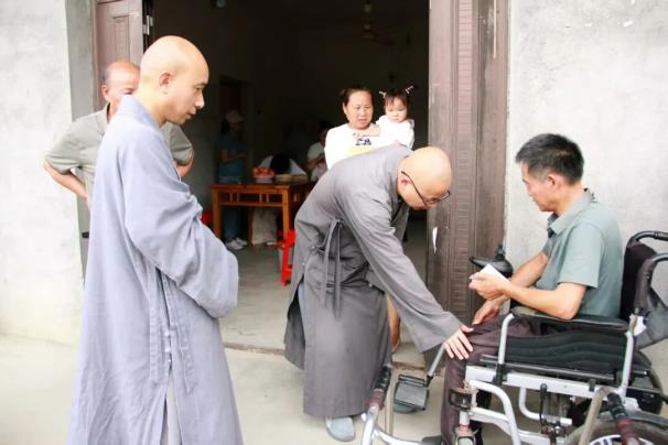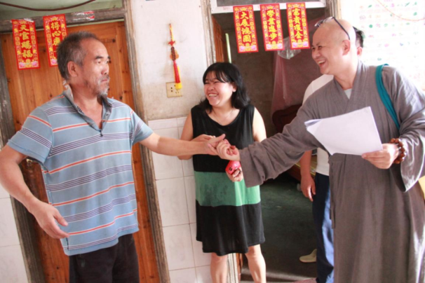 还有一位养育了7个子女的妈妈,老公脑梗丧失劳动力,还有6个孩子在读书,大儿子很争气正在读广东中医药大学,双一流高校,谈到自己的孩子,眼中全是自豪,言语充满希望。大嗓门甚至略带粗鲁的言谈中掩盖的是生活的苦楚,一家人全靠政府低保金跟她打点零工维持生活,还要照顾脑梗的丈夫。法师跟她讲:“虽然你伺候一家人很难,师父特别理解,但你不要抱怨丈夫,能成为一家人,成为夫妻不是一般的缘分,这都是因果缘分使然。而因为你的坚持,把小孩抚养成人,为社会做出贡献,这功德是很大的。我们由衷地感到赞叹。”说罢法师拿出一个红包以表抚慰。听着这些,这位妈妈接过红包再也支撑不住嚎啕大哭,像是把这些年的苦楚全都变成了泪水。最后除了助学金、慰问红包,法师还决定每月定期给她提供100斤大米、两桶油,助其减轻家庭的生活压力。像是这样的故事,一路我们看到了太多。