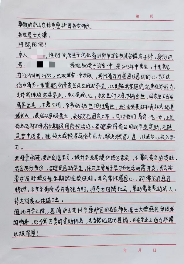 今年东林寺慈护在常住的慈悲引领下,加大助学力度,与政府、佛协、社会公益组织、爱心企业以及个人一起共同托举,助学圆梦。7月份通过官网在全国范围内发出助学公告:本年度品学兼优的高中生和应届大学生,属于困难户/低保户/低收入家庭(包括因残疾、孤儿及重大疾病导致的困难家庭)的,均可向东林寺慈护提出助学申请。经审核将为其提供:高中生2000元/学期(可以从高一到高三计6学期连续帮扶);应届本科6000元、专科5000元(一次性帮扶)额度的助学金,一场与时间赛跑的爱心接力就此展开。