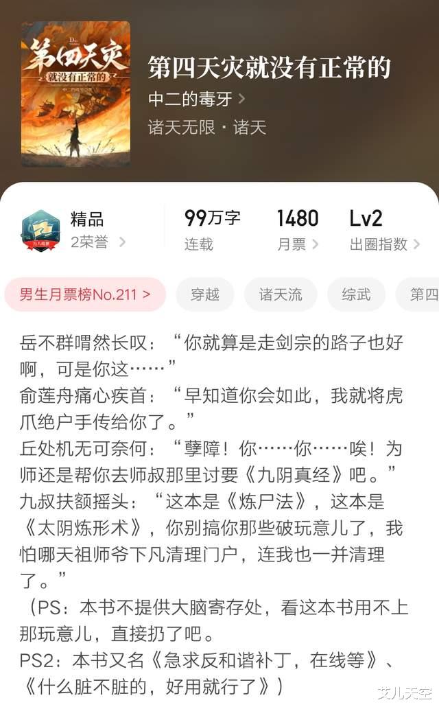 刚准备发文,又发现“中二的毒牙”的《第四天灾就没有正常的》也在今天万订了,明天抽时间看一下再说,明天见。