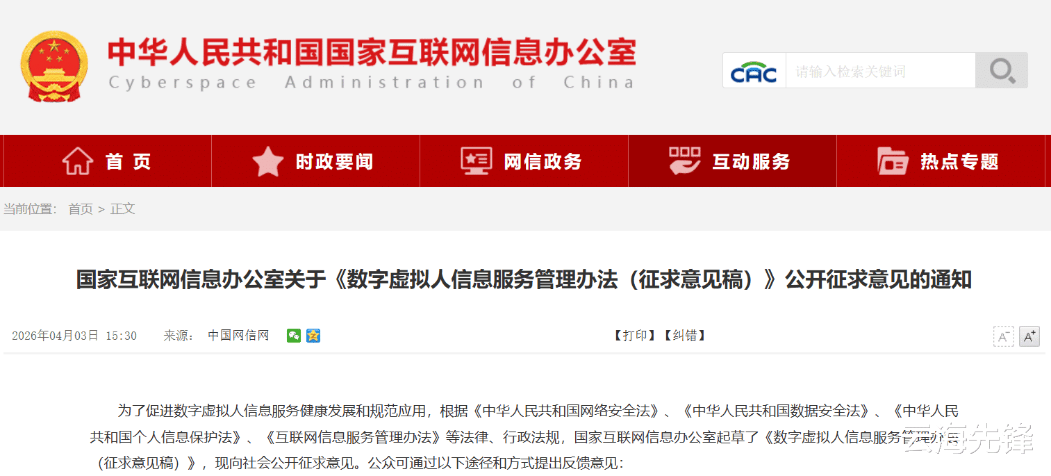 4月3日,国家互联网信息办公室发布《数字虚拟人信息服务管理办法(征求意见稿)》(以下简称征求意见稿),面向社会公开征求意见,意见反馈截止时间为2026年5月6日。