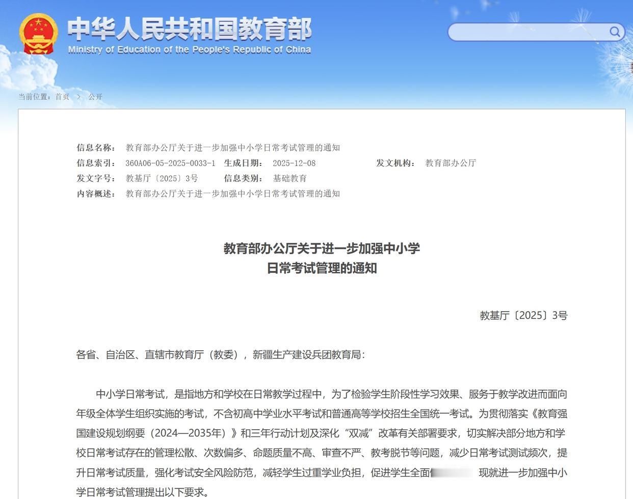 1月6日,青岛市教育科学研究院发布消息称,本学期末不组织全市高一、高二的统一调研考试,但提供试题供学校自主选择使用。成都市教育科学研究院也确认,依据教育部新规,非毕业年级不得组织区域性统一考试。此前,教育部办公厅于去年12月发布了《关于进一步加强中小学日常考试管理的通知》,强调减少考试频次、提高质量,减轻学生学业负担。
