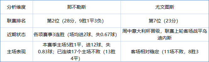 这是一场在严重伤病阴影下进行的意甲强强对话。那不勒斯拥有绝对的主场之利和更好的近期状态,但中场厚度的削弱让他们的优势打了折扣。尤文图斯客场作战且防线残缺,但或许因此放下包袱,战术更具弹性。综合来看,坐镇主场、求胜欲望更强的那不勒斯稍占上风,但平局(尤其是1-1)是一个需要高度警惕的结果。尤文若能凭借经验扎紧篱笆,也有机会从客场带走分数。