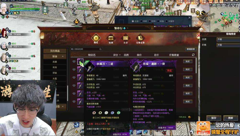 藏宝阁找玩家买金,交易行买稀有装备词条等,因为玩家们也喜欢蹲着直播间,看一看什么时候有商机给浮夸卖点东西。