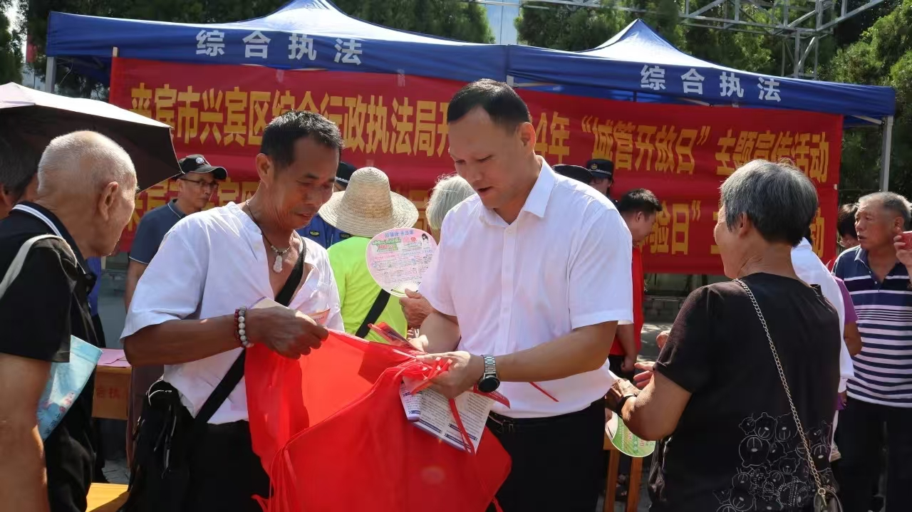 兴宾区城管大队大队长江涛向群众发放小礼品