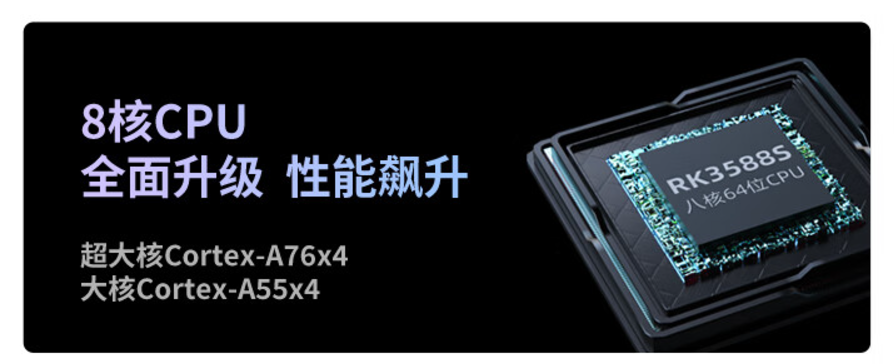 🔺首先需要说的是,对于一款播放器来说,它的核心配置就是SoC芯片。前面也说过,电视不能播放一些影视资源其实就是因为它的处理器性能不够,而作为一台专业的蓝光播放器,海美迪Q5六代搭载的是非常强悍的瑞芯微 RK3588S 处理器,这款处理器作为瑞芯微旗下高端AIoT芯片,它采用了 8nm LP 制程,搭载 八 核 64位 CPU,主频达到2.4GHz。