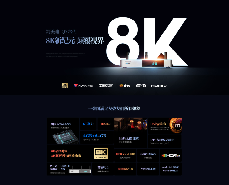今天为大家分享的这款海美迪Q5六代8K蓝光播放器就可以说是它顺应时代潮流,迎合用户高品质观影需求的又一最新力作。开始之前,先带大家了解下这款产品的核心亮点: