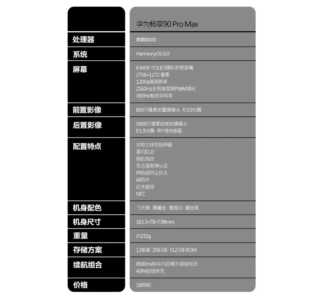华为畅享90 Pro Max是华为畅享系列首次推出Pro Max机型,标志着华为在千元市场的战略升级。这款1699元起售的机型以麒麟8000芯片、8500mAh巨鲸电池和鸿蒙6.0系统为核心配置,通过下放双频GPS三频北斗、Wi-Fi 7、IP65防水等原本中高端机型的功能,配合玄甲机身设计和双五星耐摔认证,重新定义入门级手机的品质范本。