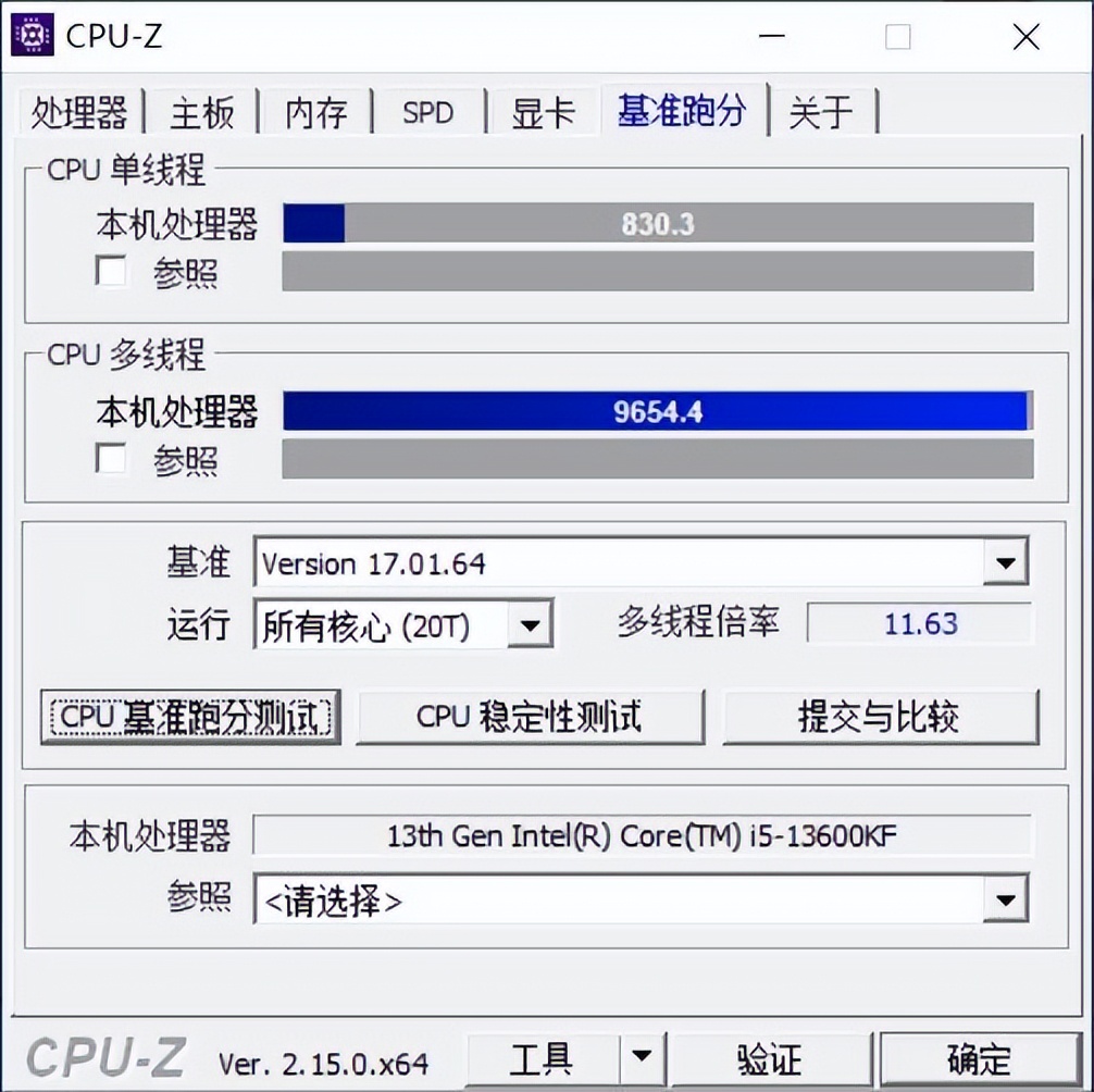 然后开了CPU-Z,测试下了基准跑分,单核830.3,多喝9654.4.没有超频,有降了点电压,不然温度有点高。