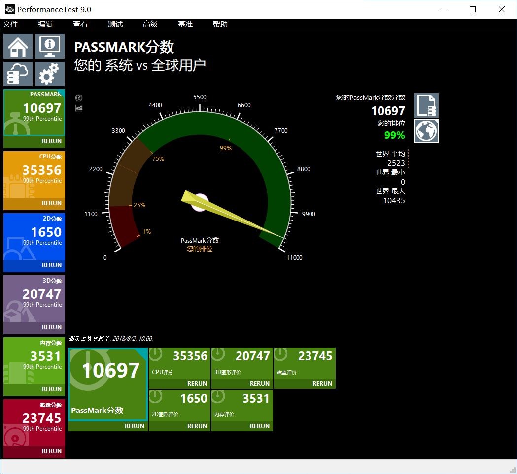 跑了下PassMark,总得分10697,其中CPU得分35356,2D得分1650,3D得分20747,内存得分3531,硬盘得分23745.
